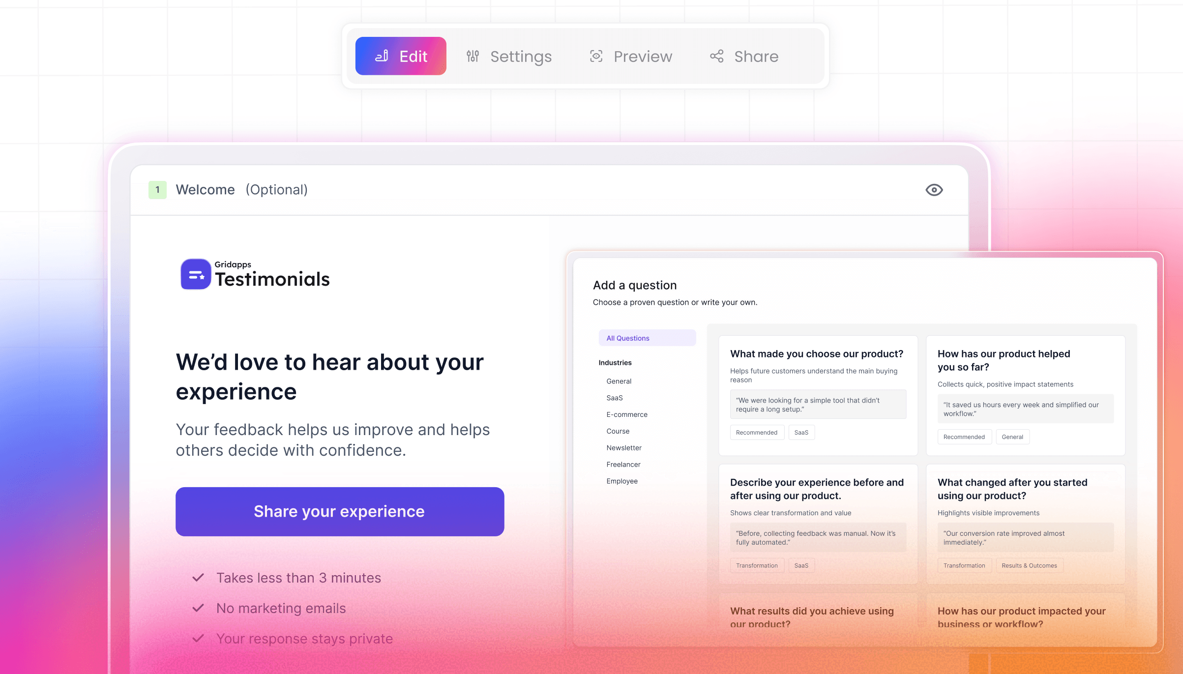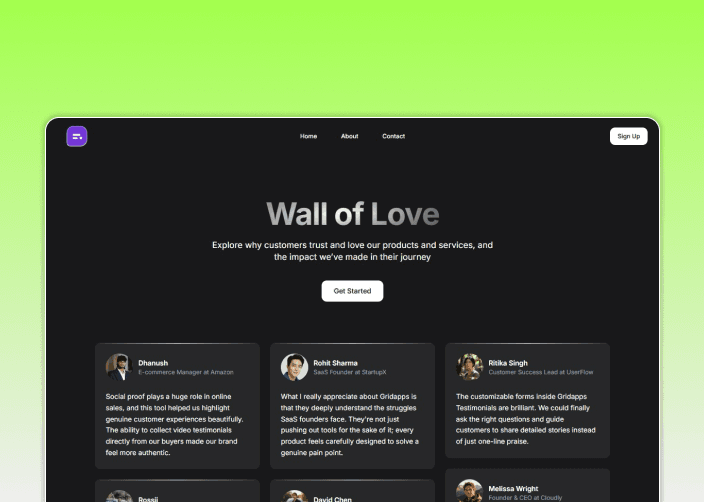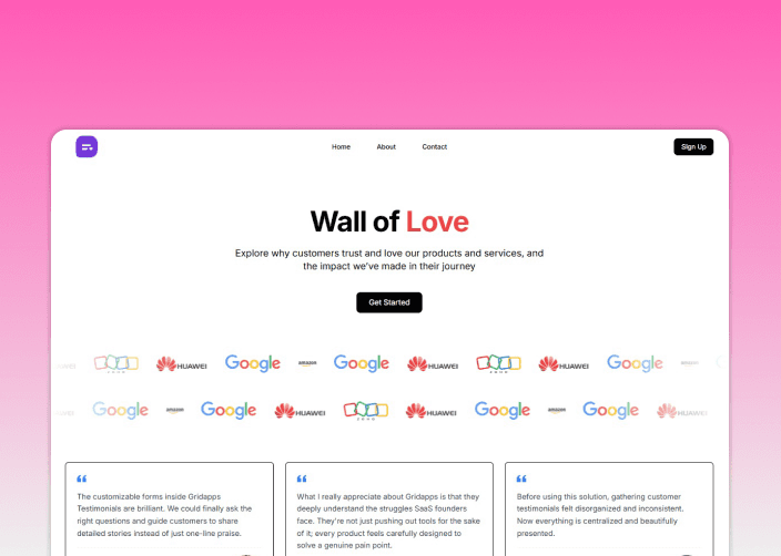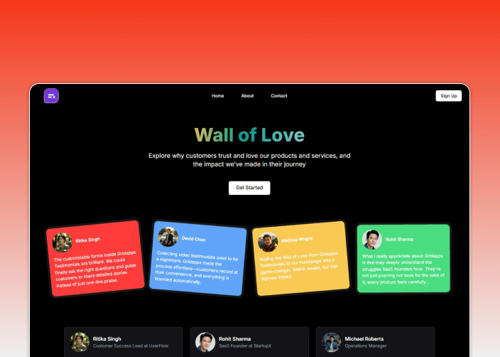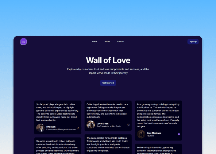 Build a powerful showcase of trust with Gridapps’ Studio, your complete solution for testimonials and social proof.