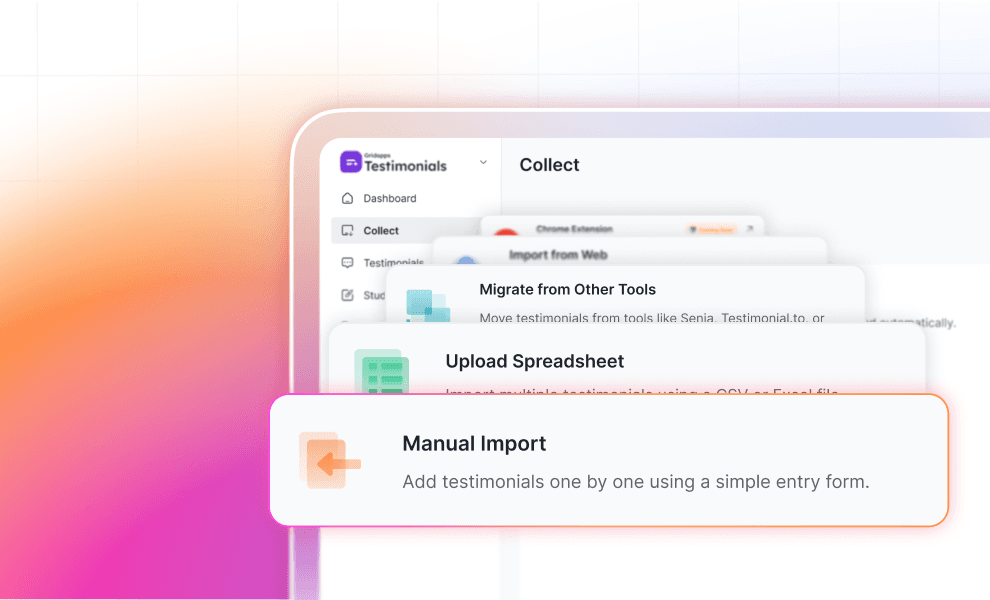 Effortlessly gather, organize, and display customer Testimonials. From customizable forms to instant imports and stunning content creation, all streamlined for your success.