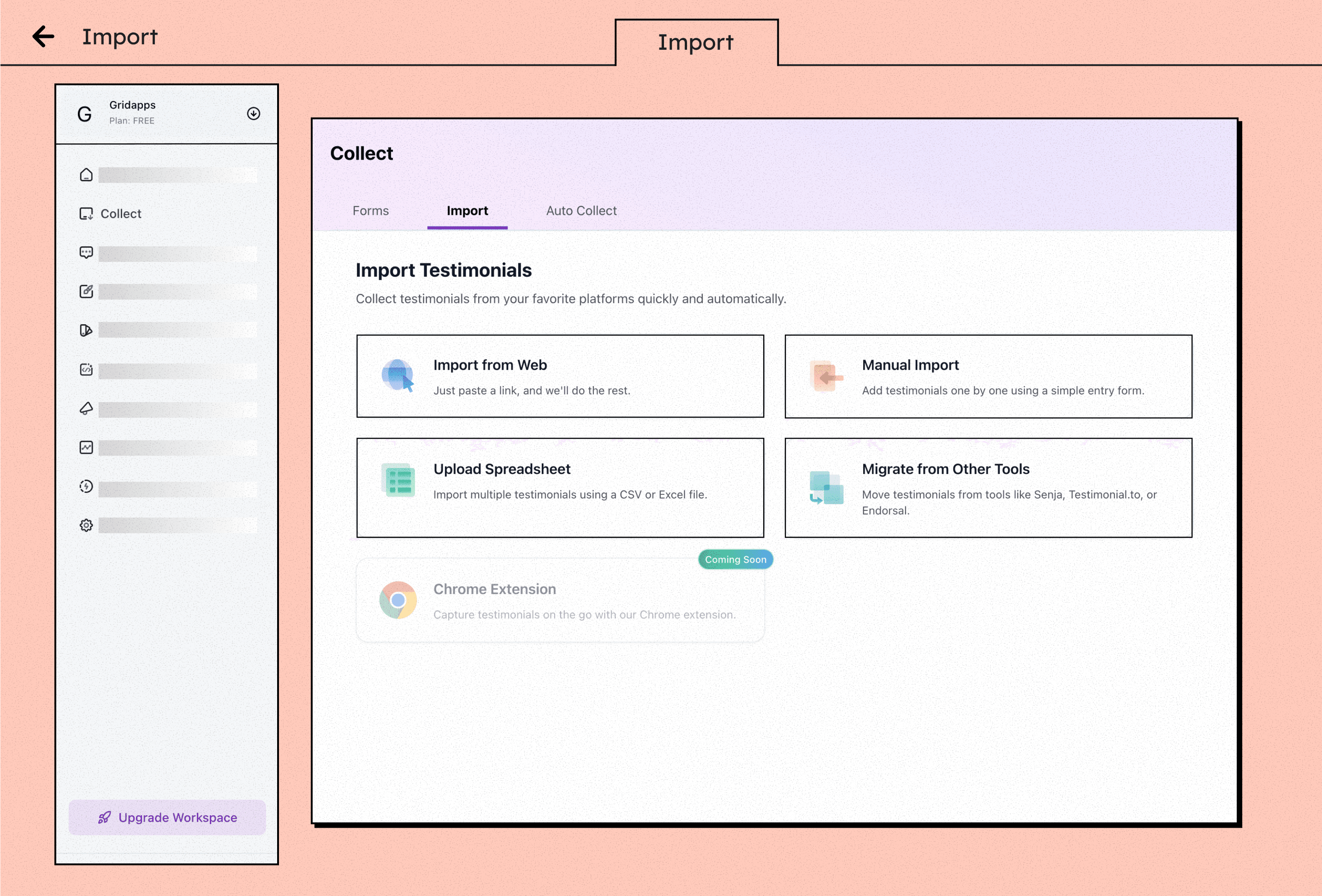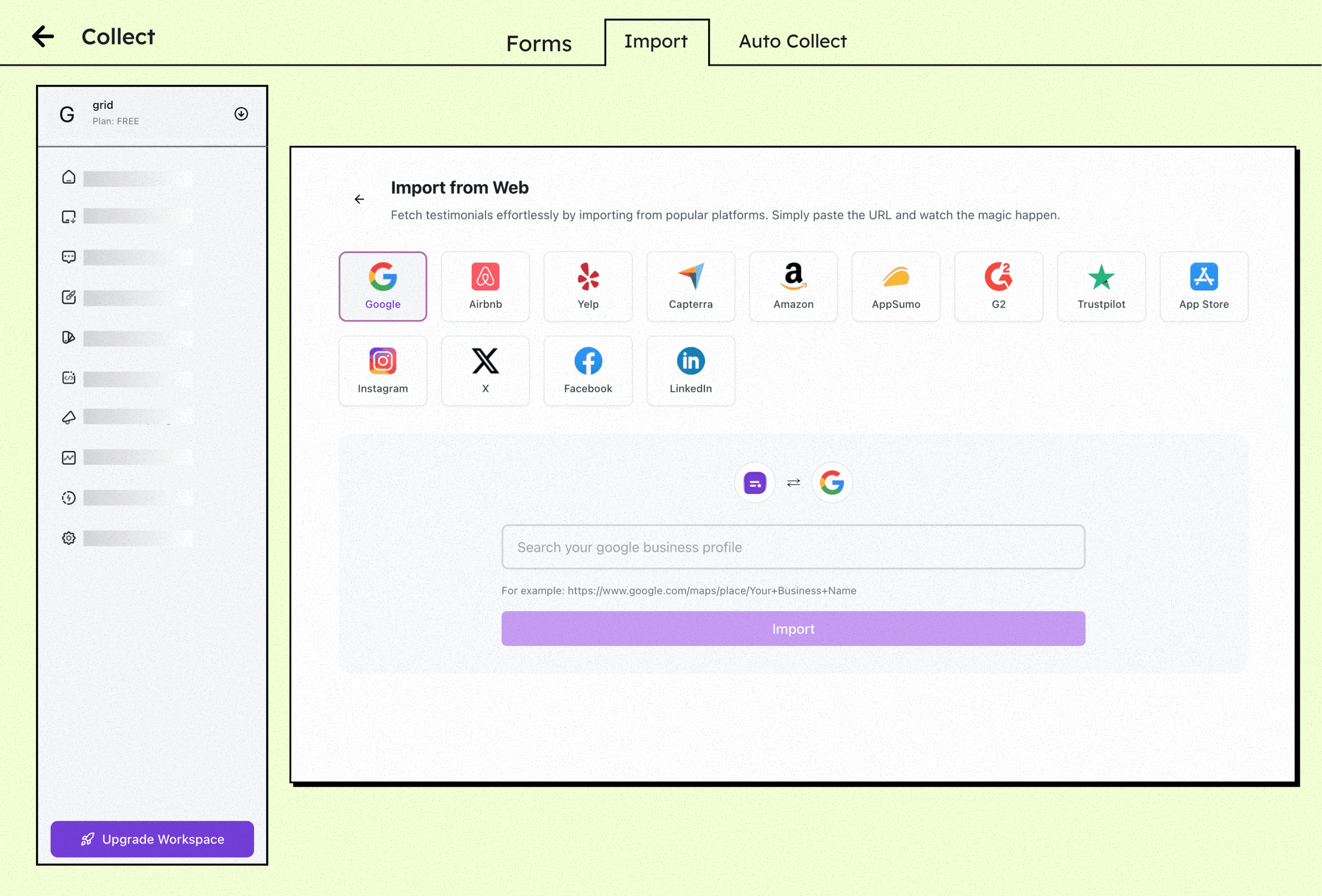 Inside the Collect section, select the Import tab to bring in testimonials from external platforms.